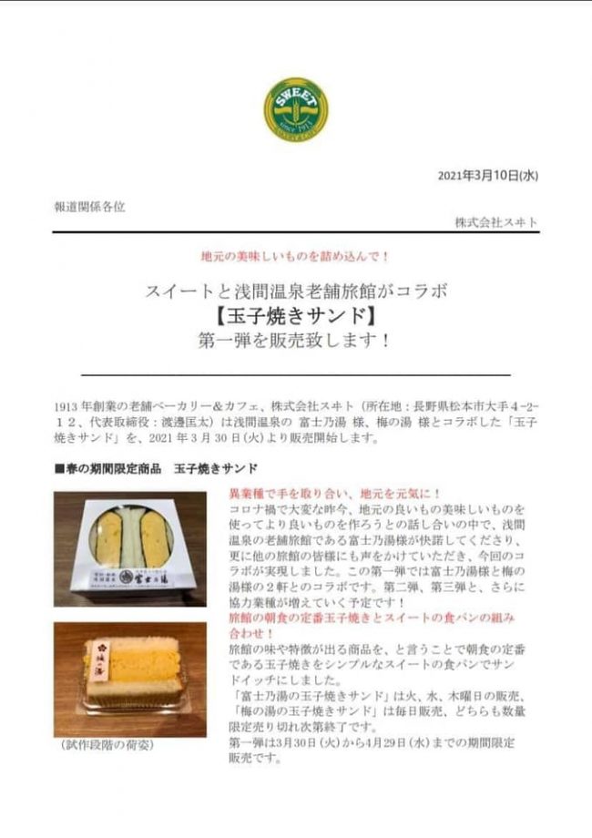 「玉子焼きサンド」発売です 2021.03.28 みんな大好き、松本の老舗パン屋さんスイートさんのパンと 富士乃湯の玉子焼きがコラボ 「玉子焼きサンド」 来週3月30日からスイートさんの店舗にて発売開始です(^^) (1か月の限定販売。火、水、木) このコラボ、SBC信越放送さまに取材していただきました。 いつもの苦境に立たされたコメントから一転、明るい話題での取材でした♪ 玉子焼きサンド、ぜひご賞味ください < 前の記事へ 記事一覧へ 次の記事へ > 最近の投稿 節分の設えに 長野県民宿泊応援プラン発売中です 公式サイトをリニューアルいたしました。 夜桜見物バス運行します ゴジラシューズご覧いただけます! カテゴリ別投稿 新着情報 富士乃湯のこと 温泉 日記 月別アーカイブ 月を選択 2026年1月 (3) 2024年4月 (1) 2024年3月 (3) 2024年2月 (2) 2024年1月 (3) 2023年12月 (4) 2023年8月 (1) 2023年7月 (2) 2023年6月 (1) 2023年5月 (1) 2023年4月 (1) 2023年3月 (1) 2023年2月 (1) 2023年1月 (1) 2022年12月 (2) 2022年10月 (4) 2022年9月 (1) 2022年7月 (3) 2022年6月 (1) 2022年5月 (1) 2022年4月 (6) 2022年3月 (5) 2022年2月 (5) 2022年1月 (4) 2021年12月 (2) 2021年11月 (2) 2021年10月 (3) 2021年9月 (5) 2021年8月 (3) 2021年7月 (4) 2021年6月 (4) 2021年5月 (6) 2021年4月 (11) 2021年3月 (1) 2021年2月 (3) 2021年1月 (6) 2020年12月 (3) 2020年9月 (2) 2020年8月 (2) 2020年7月 (3) 2020年6月 (7) 2020年5月 (5) 2020年4月 (7) 2020年3月 (3) 2020年2月 (6) 2020年1月 (3)