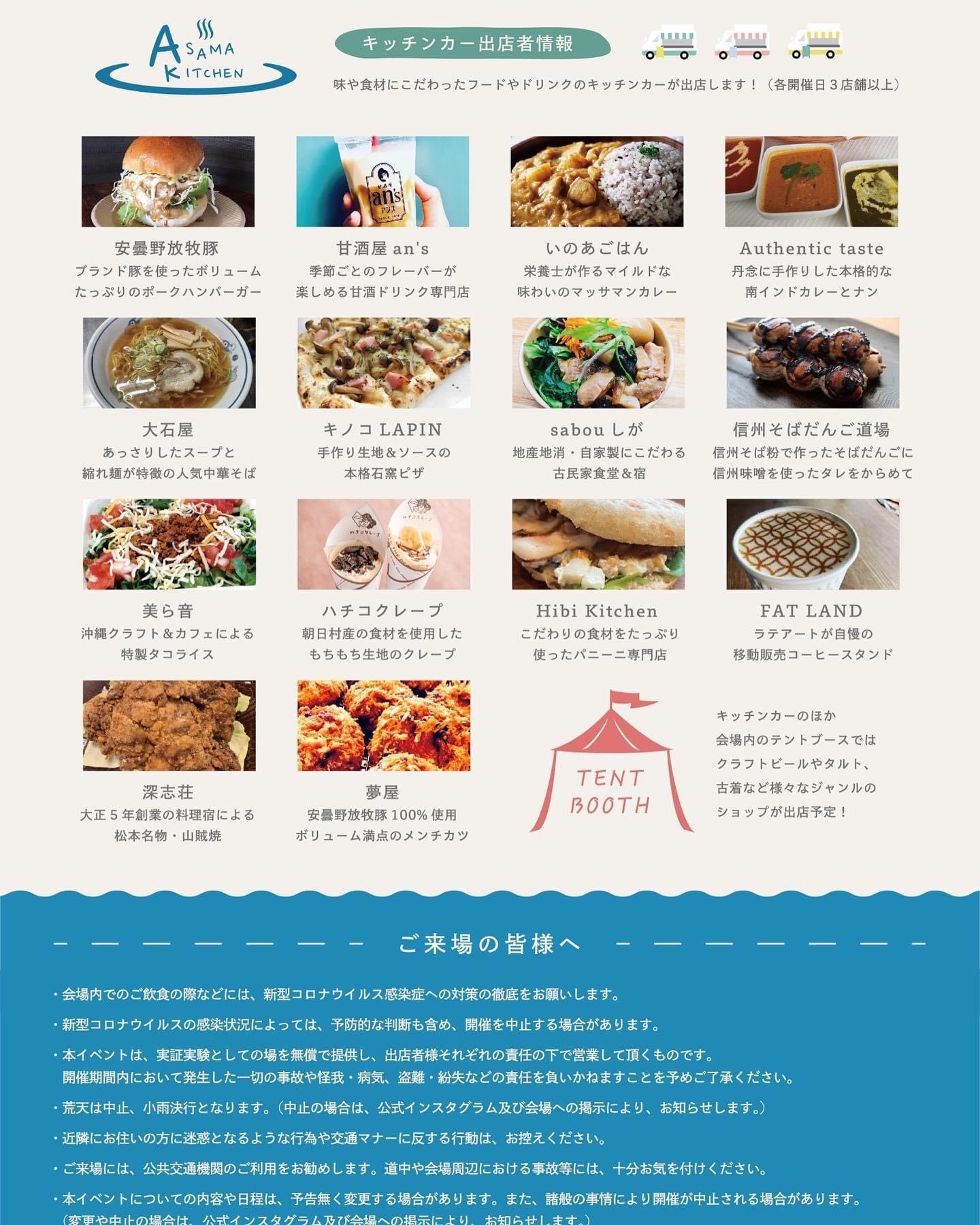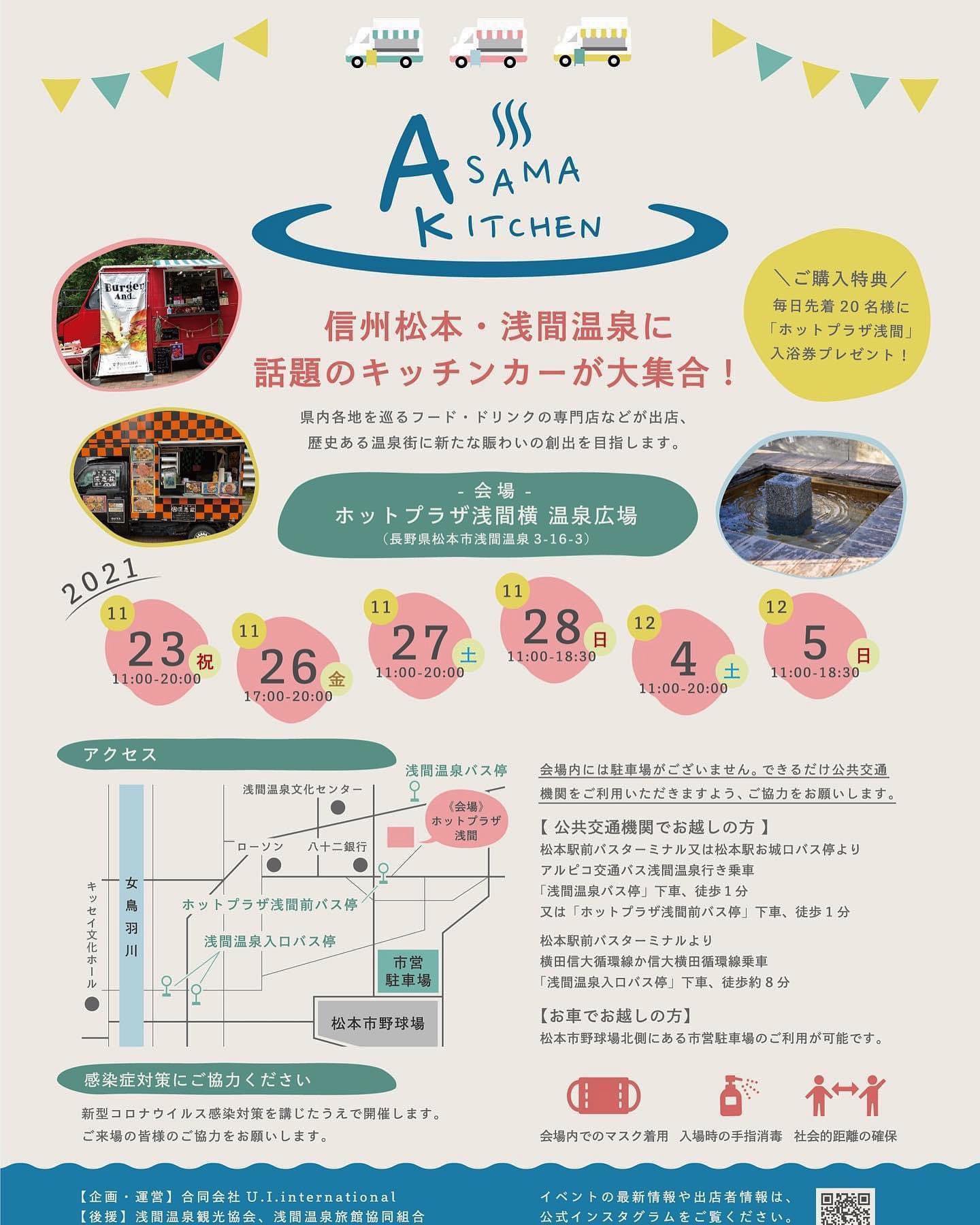 キッチンカー大集合。浅間キッチン! 2021.11.09 浅間キッチンオープンです✨✨ 浅間温泉に県内のキッチンカーが大集合します。 県内産の食材を使った美味しいものがいっぱい! お腹いっぱいになったら、浅間の街♨️を隅々までお散歩してみてくださいね。 皆さまのお越しをお待ちしております(^^) このコラボイベントは、当館も参加している、観光庁の「既存観光拠点の再生・高付加価値化推進事業」実証実験です。 < 前の記事へ 記事一覧へ 次の記事へ > 最近の投稿 節分の設えに 長野県民宿泊応援プラン発売中です 公式サイトをリニューアルいたしました。 夜桜見物バス運行します ゴジラシューズご覧いただけます! カテゴリ別投稿 新着情報 富士乃湯のこと 温泉 日記 月別アーカイブ 月を選択 2026年1月 (3) 2024年4月 (1) 2024年3月 (3) 2024年2月 (2) 2024年1月 (3) 2023年12月 (4) 2023年8月 (1) 2023年7月 (2) 2023年6月 (1) 2023年5月 (1) 2023年4月 (1) 2023年3月 (1) 2023年2月 (1) 2023年1月 (1) 2022年12月 (2) 2022年10月 (4) 2022年9月 (1) 2022年7月 (3) 2022年6月 (1) 2022年5月 (1) 2022年4月 (6) 2022年3月 (5) 2022年2月 (5) 2022年1月 (4) 2021年12月 (2) 2021年11月 (2) 2021年10月 (3) 2021年9月 (5) 2021年8月 (3) 2021年7月 (4) 2021年6月 (4) 2021年5月 (6) 2021年4月 (11) 2021年3月 (1) 2021年2月 (3) 2021年1月 (6) 2020年12月 (3) 2020年9月 (2) 2020年8月 (2) 2020年7月 (3) 2020年6月 (7) 2020年5月 (5) 2020年4月 (7) 2020年3月 (3) 2020年2月 (6) 2020年1月 (3)
