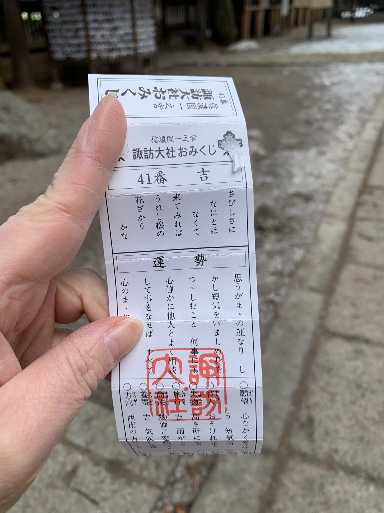 御神渡りは? 2022.01.24 先日の休館日に諏訪へ行ってまいりました。 諏訪湖、朝方は寒さで全面氷結したそう。 御柱祭の今年、御神渡り期待できそうですね。 諏訪大社上社、下社と二社お詣りしました。 四社まわって御朱印を集めると記念品がいただけるそうですよ(^^) そして、上社でひいたおみくじには「短気は凶」とやたら書いてある😅 うーん、、心静かに準備をし、時を待ちたいと思います。 諏訪湖までは当館よりお車で45分ほどです。 < 前の記事へ 記事一覧へ 次の記事へ > 最近の投稿 節分の設えに 長野県民宿泊応援プラン発売中です 公式サイトをリニューアルいたしました。 夜桜見物バス運行します ゴジラシューズご覧いただけます! カテゴリ別投稿 新着情報 富士乃湯のこと 温泉 日記 月別アーカイブ 月を選択 2026年1月 (3) 2024年4月 (1) 2024年3月 (3) 2024年2月 (2) 2024年1月 (3) 2023年12月 (4) 2023年8月 (1) 2023年7月 (2) 2023年6月 (1) 2023年5月 (1) 2023年4月 (1) 2023年3月 (1) 2023年2月 (1) 2023年1月 (1) 2022年12月 (2) 2022年10月 (4) 2022年9月 (1) 2022年7月 (3) 2022年6月 (1) 2022年5月 (1) 2022年4月 (6) 2022年3月 (5) 2022年2月 (5) 2022年1月 (4) 2021年12月 (2) 2021年11月 (2) 2021年10月 (3) 2021年9月 (5) 2021年8月 (3) 2021年7月 (4) 2021年6月 (4) 2021年5月 (6) 2021年4月 (11) 2021年3月 (1) 2021年2月 (3) 2021年1月 (6) 2020年12月 (3) 2020年9月 (2) 2020年8月 (2) 2020年7月 (3) 2020年6月 (7) 2020年5月 (5) 2020年4月 (7) 2020年3月 (3) 2020年2月 (6) 2020年1月 (3)