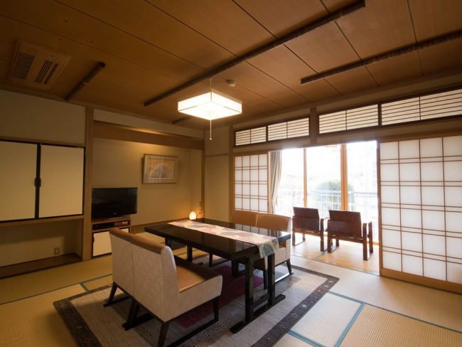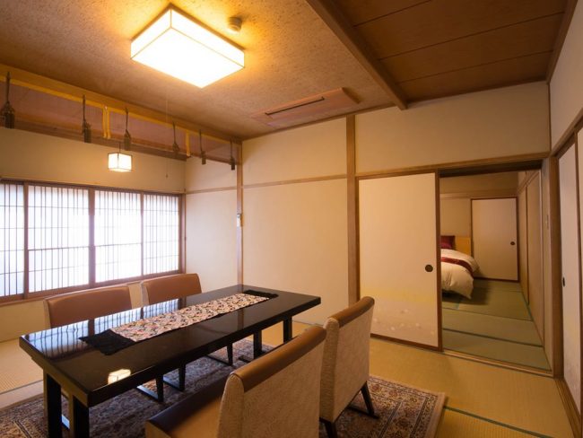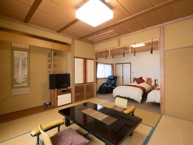 りんどうとすずらんは、和室のリビング・ダイニング、ベッドルーム、源泉100%温泉かけ流しの半露天風呂が備わった特別室でございます。